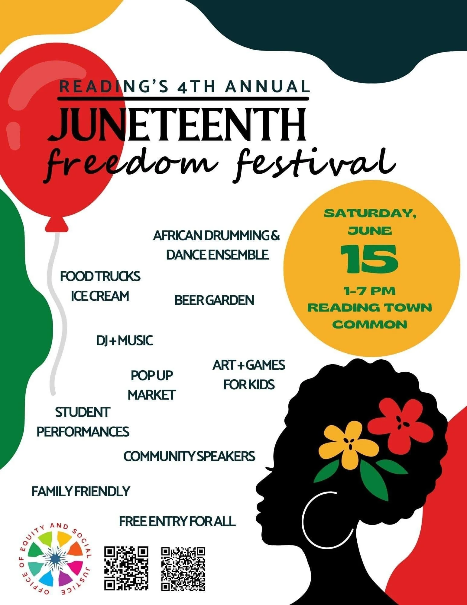 Juneteenth is an annual celebration marking the formal end of slavery in the United States, celebrated following the arrival of emancipation news in Texas after the conclusion of the Civil War and the issuance of President Abraham Lincoln’s Emancipation Proclamation. Since 2021, the Town of Reading has hosted an annual Freedom Festival on the Town Common. This event features Black, Indigenous, and People of Color (BIPOC) vendors and organizers with missions centered on anti-racism and Diversity, Equity, Inclusion and Accessibility (DEIA), alongside live music performances and DJs.